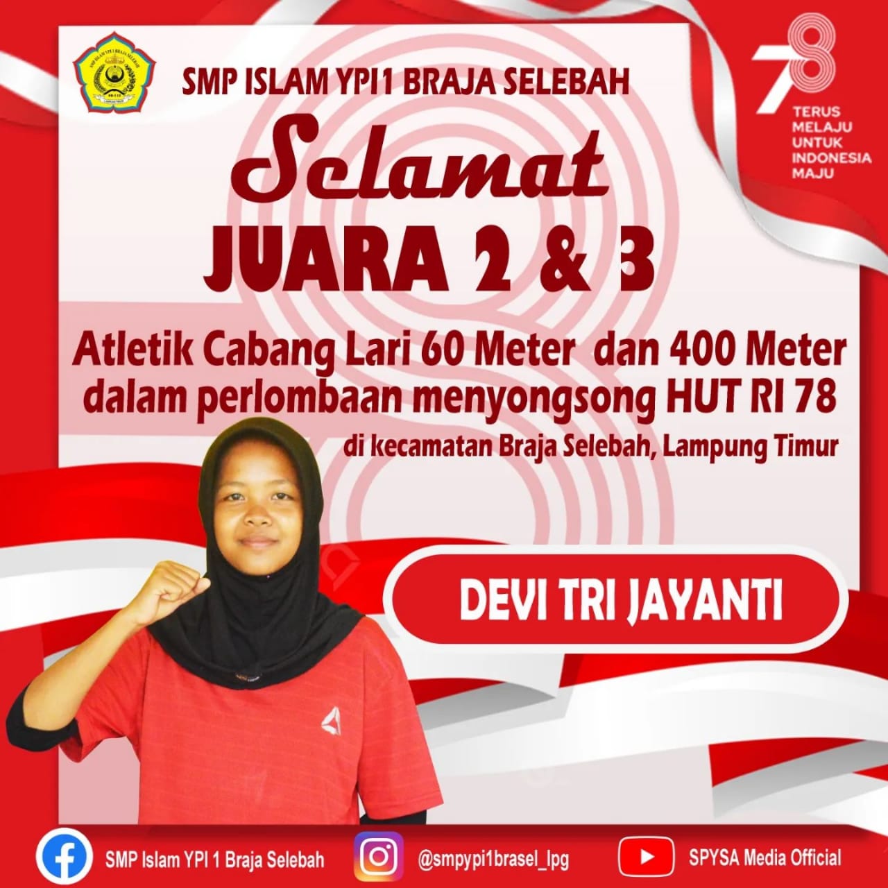 Selamat atas prestasi kepada ananda: DEVI TRI JAYANTI (Juara 2 Atletik Cabang Lari 60 meter) & (Juara 3 Atletik Cabang Lari 400 meter) Tingkat Kecamatan Dalam rangka memeriahkan Hari Kemerdekaan Indonesia yang ke-78