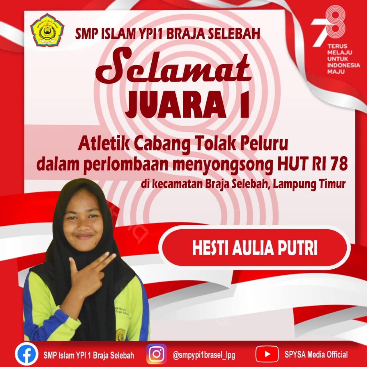 Selamat atas prestasi kepada ananda: HESTI AULIA PUTRI (Juara 1) Atletik Cabang Tolak Peluru Tingkat Kecamatan Dalam rangka memeriahkan Hari Kemerdekaan Indonesia yang ke-78