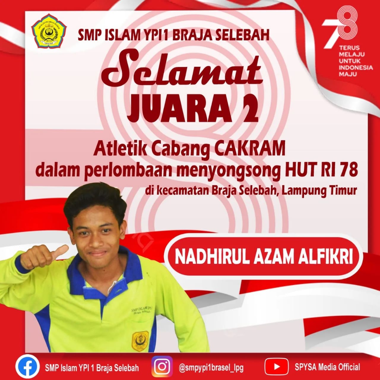 Selamat atas prestasi kepada ananda: NADHIRUL AZAM ALFIKRI (Juara 2) Atletik Cabang Lempar Cakram Tingkat Kecamatan Dalam rangka memeriahkan Hari Kemerdekaan Indonesia yang ke-78
