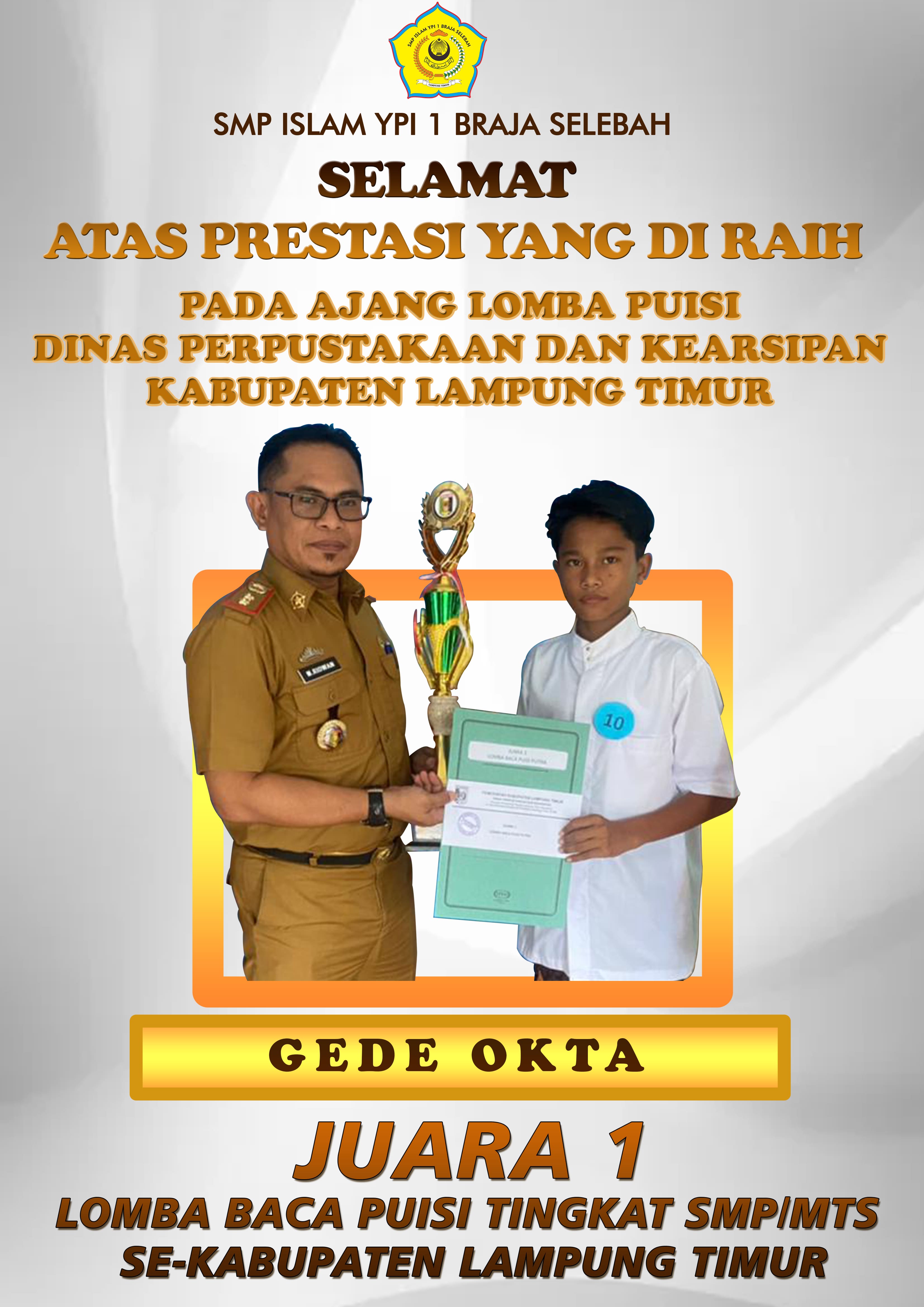 Selamat dan Sukses kepada ananda Gede Okta atas diraihnya Juara 1 Lomba Baca Puisi tingkat SMP/MTs Se-Kabupaten Lampung Timur yang di selenggarakan oleh Dinas Perpustakaan dan Kearsipan Kab. Lampung Timur.